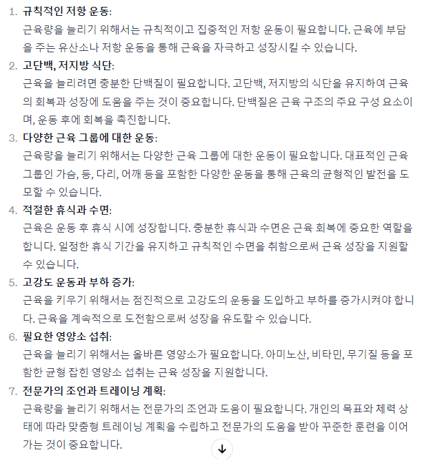 이러한 방법들을 조합하여 꾸준하고 계획적인 운동과 올바른 영양 섭취를 통해 근육량을 효과적으로 늘릴 수 있습니다. 하지만 특정 질병이나 건강 상태를 고려하여 운동을 시작하기 전에 전문가와 상담하는 것이 중요합니다.
